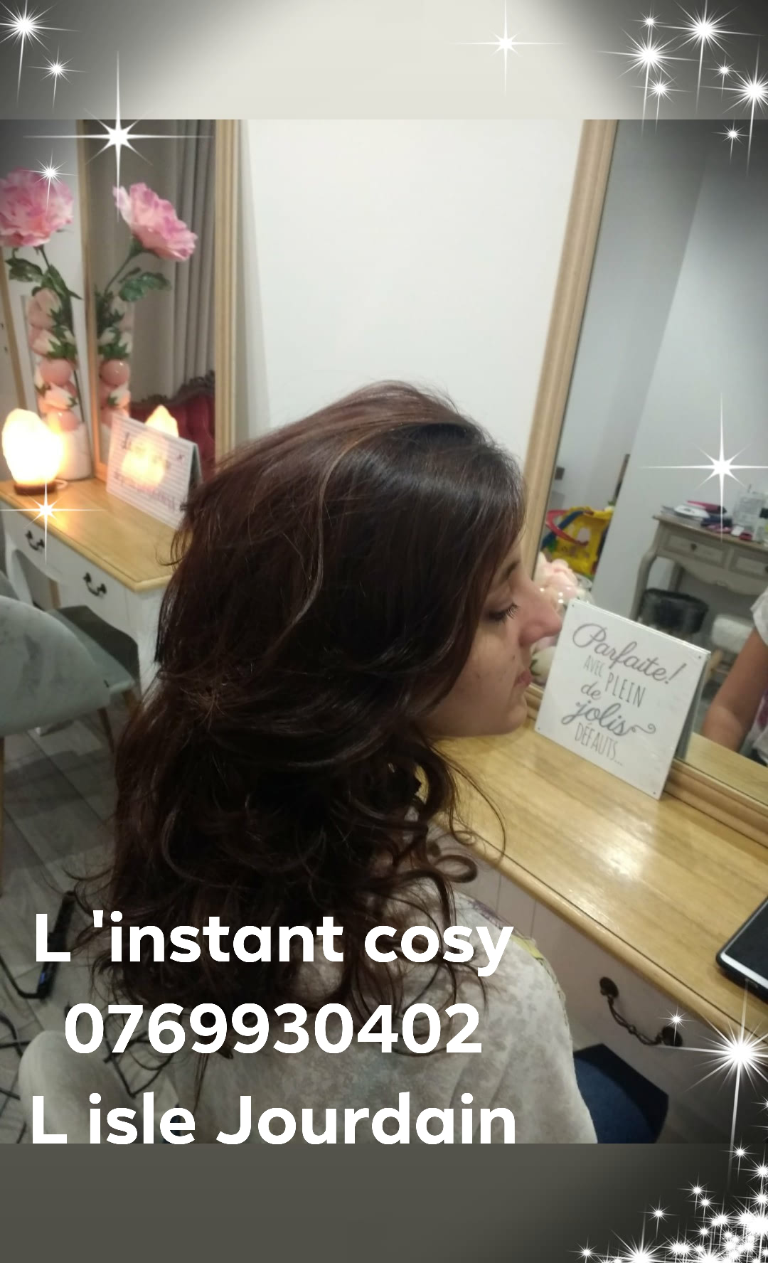 Merci Flora pour ma nouvelle coupe 💇♀️, tu as été très professionnelle, tu es restée dans le naturel, je t’ai fait confiance avec mes cheveux longs que tu as coupé et à la fin le rendu est juste magnifique 🤩 . Je vous conseille à tous d’aller chez Flora « L’ instant Cosy à Clermont Savès » et le salon est très Cosy avec thé, café petits gâteaux 🧁 tous pour être chouchouté.